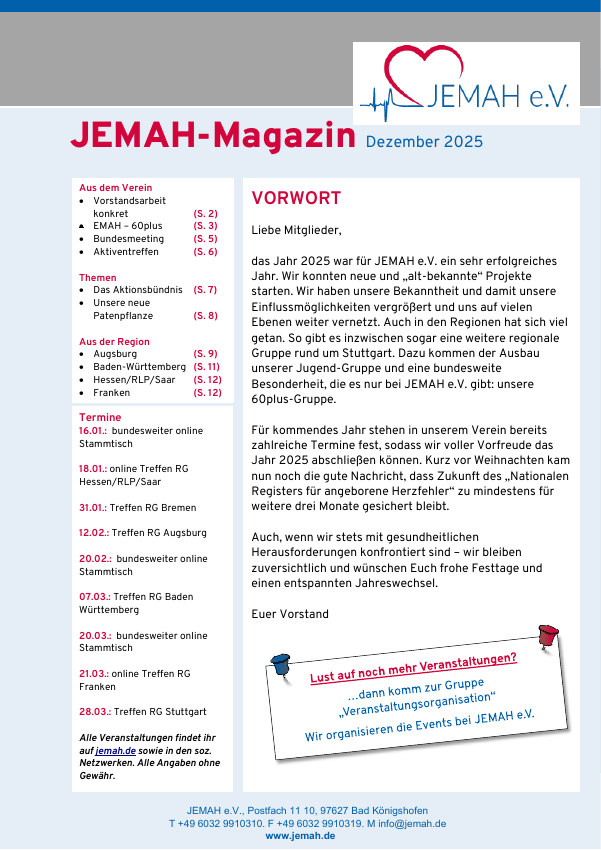 Das Jemah-Magazin ist nicht nur für unsere Mitglieder eine wichtige Informationsquelle über das Geschehen im Verein. Alle Interessierten sind eingeladen, einen Blick hinein zuwerfen.